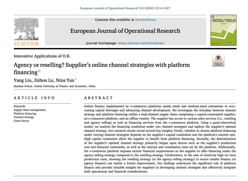 近日,122cc太阳集成游戏技术经济及管理专业硕博连读研究生柳阳,在供应链与运营管理系晏妮娜教授和卢继周副教授的指导下,以第一作者身份在运营管理领域的旗舰期刊 《European Journal of Operational Research》发表了题为“Agency or Reselling? Supplier’s Online Channel Strategies with Platform Financing”的学术论文。EJOR是ABS-4级期刊,同时也是中央财经大学校认定的AAA类重要期刊。这是柳阳同学在硕博连读期间发表的第二篇AB...